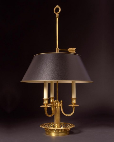 Gilded bronze three light bouillote with square arm & bronze fretwork base