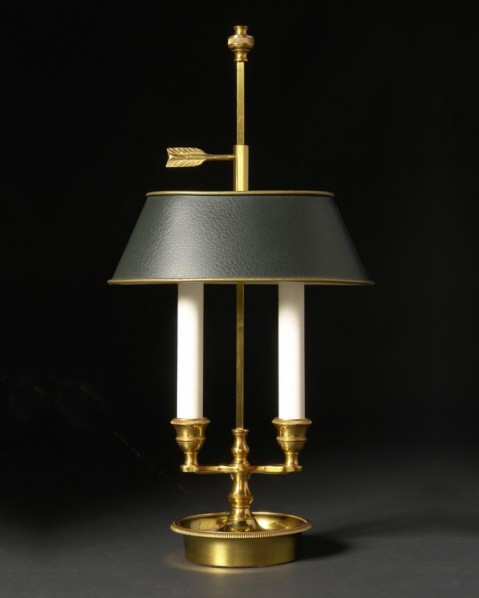 Gilded bronze two light bouillotte with oval tole shade