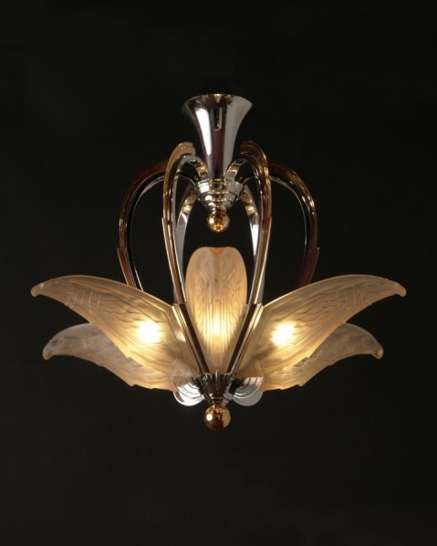 MAYNADIER nickel and chrome "Eagles" chandelier in rose molded glass, France, circa 1930